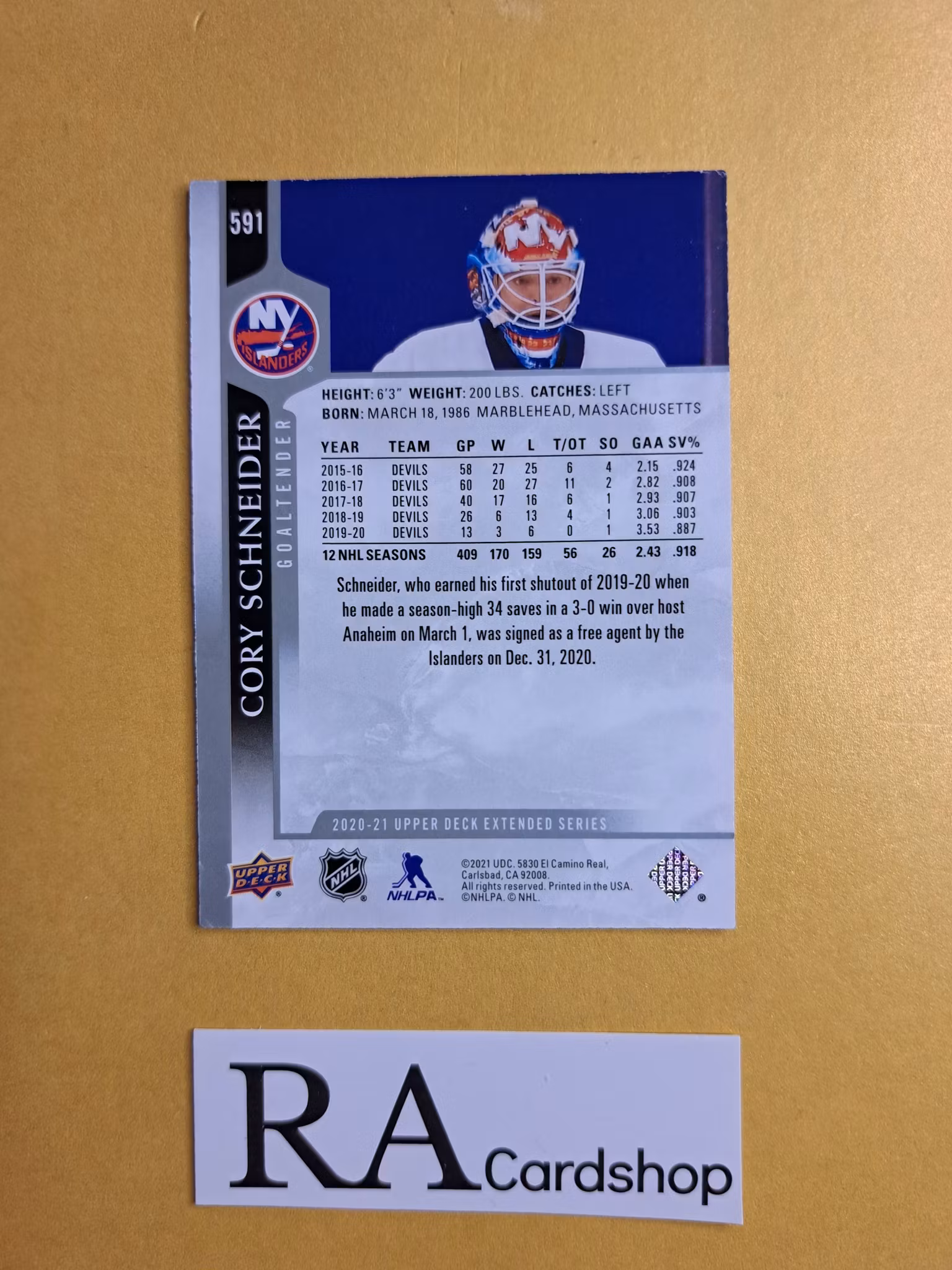 #591 Cory Schneider 2020-21 Upper Deck Extended Series Hockey
